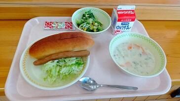 ホットドッグ、白花豆のポタージュ、ブロッコリーサラダ、牛乳