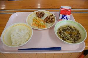 麦ごはん、もずくのスープ、鶏肉のからあげ、レモン和え、牛乳