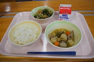 麦ごはん、とりにくと里芋のみそに、小松菜のサラダ、牛乳