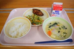 麦ごはん、にらたま汁、かんぱちの変わり揚げ、添え野菜、牛乳