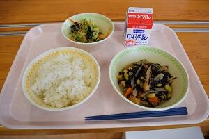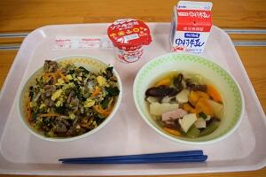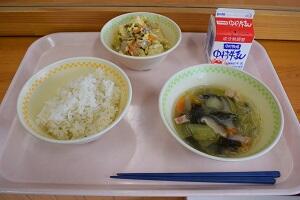 千切り大根ごはん、小松菜のみそ汁、ひじきの白和え、牛乳