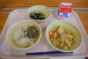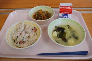 たこごはん、じゃがいものみそ汁、きんぴらごぼう、牛乳