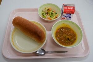 コッペパン、トマトと玉ねぎのにこにこスープ、スパゲティサラダ、牛乳