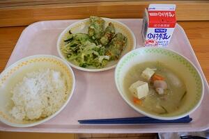 麦ごはん、野菜のみそ煮、小松菜とじゃこのサラダ、牛乳