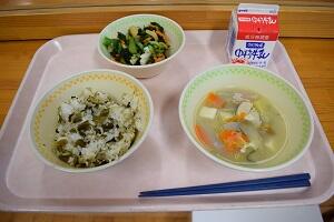 高菜ごはん、さつま汁、千草和え、牛乳