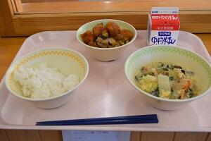 麦ごはん、いわしのしょうが煮、野菜のレモンあえ、みそけんちん汁、牛乳