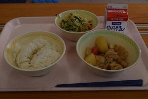 麦ごはん、じゃがいものうま煮、菜の花あえ、牛乳