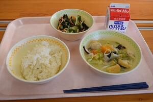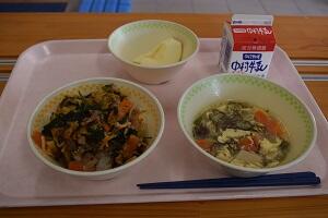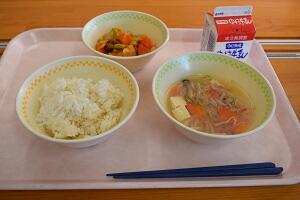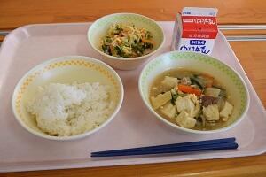 麦ごはん、厚揚げのいそ煮、野菜とツナの和えもの、牛乳