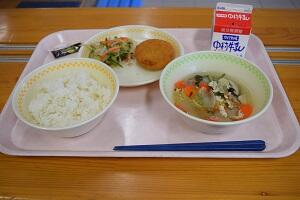 麦ごはん、日向鶏コロッケ、もやしの和えもの、野菜のそぼろ汁、牛乳