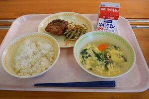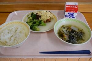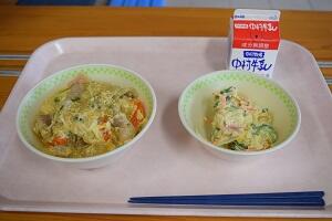 麦ごはん、高野豆腐の卵とじ、新玉ねぎのフレッシュサラダ、牛乳