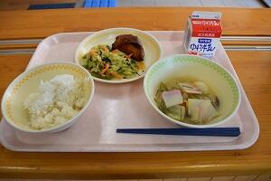麦ごはん、魚のしょうがみそかけ、添え野菜、五目汁、牛乳