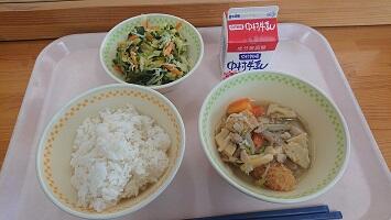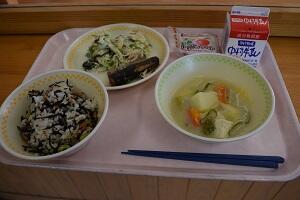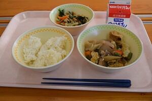 さつまいもごはん、高野豆腐の卵とじ、りっちゃんのサラダ、牛乳