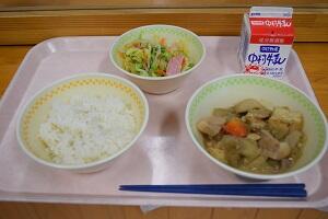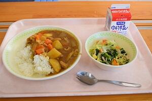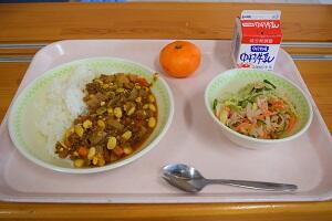 ドライカレー、れんこんサラダ、牛乳、みかん