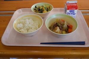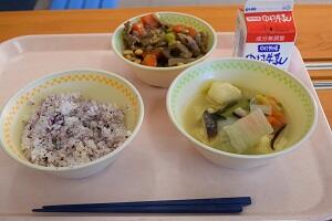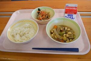 麦ごはん、とり肉と大豆の煮物、小松菜のおひたし、牛乳