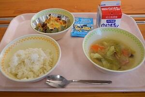 麦ごはん、ふりかけ、マカロニグラタン、野菜スープ、牛乳