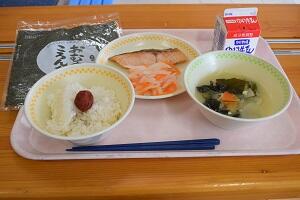 セルフおにぎり、鮭の塩焼き、カブの酢の物、みそ汁、牛乳