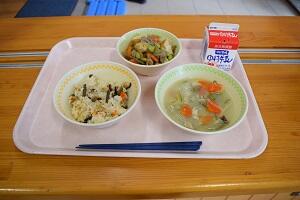 麦ごはん、ひじきの炒り煮、魚のみそ汁、牛乳