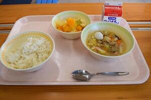 とうきびご飯、煮しめ、野菜のそぼろ汁、バナナ、牛乳