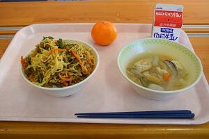 梅菜めし、スープスパゲティ、カラフルサラダ、牛乳