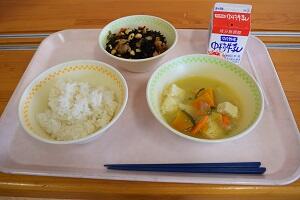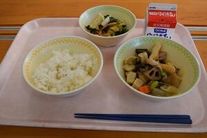 麦ごはん、五目きんぴら、さといものみそ汁、牛乳