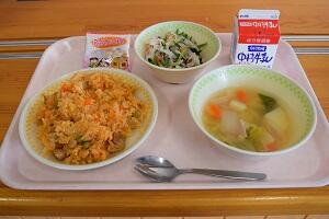 チャーハン、マロニースープ、じゃこサラダ、牛乳