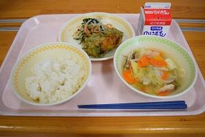 麦ごはん、あじの磯辺揚げ、ほうれん草の和えもの、ごもく汁、牛乳