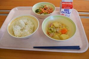 麦ごはん、じゃがいもとベーコンの煮物、和風サラダ、牛乳