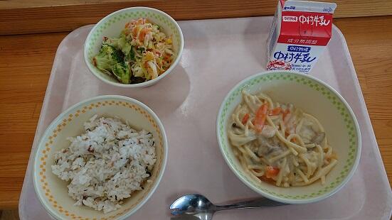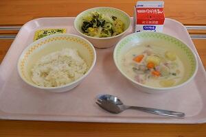 麦ごはん、ふりかけ、クラムチャウダー、ほうれん草とコーンのサラダ、牛乳