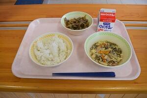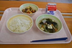 ひじきご飯、みそけんちん汁、小松菜のサラダ、牛乳