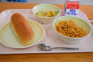 ミルクパン、スパゲティミートソース、ズッキーニのサラダ、牛乳