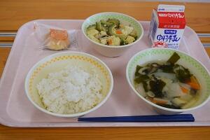 麦ごはん、なすと厚揚げのみそ炒め、ちくわときゅうりの酢の物、牛乳