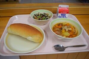 高千穂牛の混ぜご飯、ポテトスープ、高千穂どれサラダ、牛乳