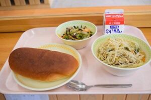 ミルクパン、炒めビーフン、海藻サラダ、牛乳