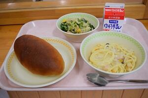黒糖パン・牛乳・スープスパゲティ・ほうれん草とコーンのサラダ