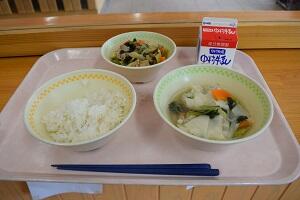 麦ごはん、小松菜と豚肉のうまみそ炒め、ワンタンスープ、牛乳