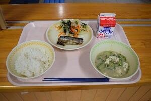麦ごはん、いわしのトマト煮、ほうれん草のごまよごし、かみなり汁、牛乳