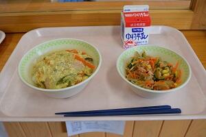 麦ごはん、高野豆腐の卵とじ、からしあえ、牛乳
