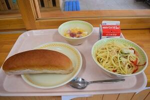 ミルクパン、スパゲッティミートソース、ズッキーニのサラダ、牛乳