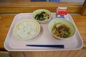 麦ごはん、夏野菜の煮物、海藻サラダ、牛乳