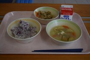 ゆかりご飯、魚のみそ汁、千切り大根の炒め煮、牛乳