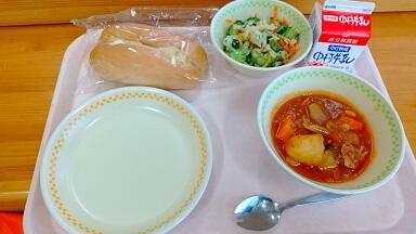 マヨネーズパン、チリコンカン、ブロッコリーサラダ、牛乳