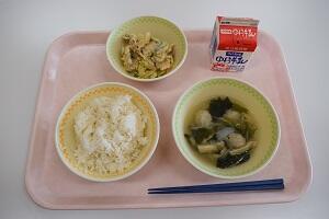 麦ごはん、鶏団子汁、豚肉のごまみそマヨネーズ、牛乳