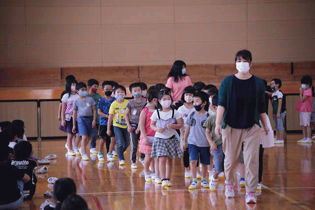児童は自分の靴と傘を取りに行き、その後体育館に地区ごとに集合しました。