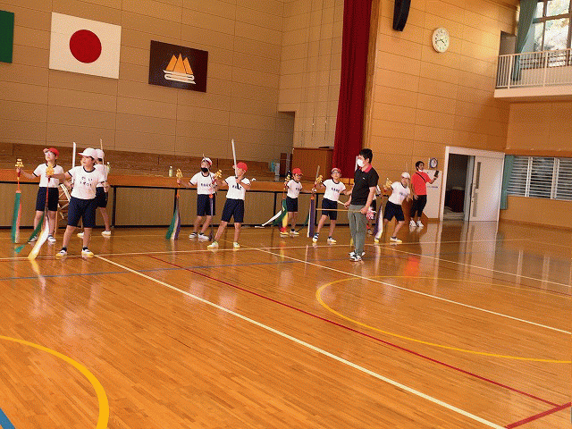 今日は、地域の神楽保存会の方が8名みえて、子どもたちに熱心に指導していただきました。