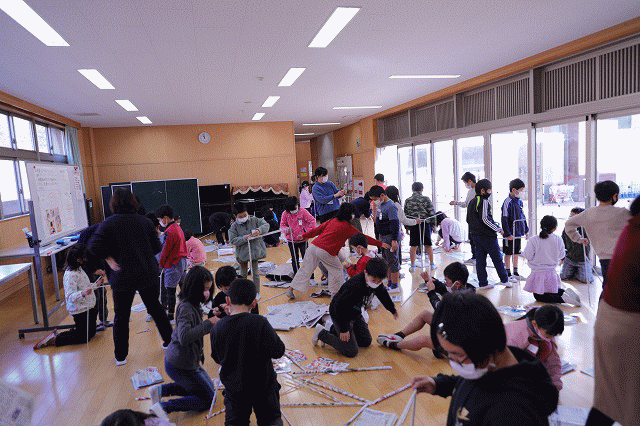 1年生の算数は、「もののいち」で左から何番目、上から何番目はどこかという問題から、もののいちについて学んでいました。2年生は、体育の「多様な動きを作る運動遊び」をしました。グループを作り、自己紹介をした後、ボールを使って後ろの人に横からや股の間からボールを渡すなど楽しいゲームをしていました。4年生は、図工の「つなぐぐんぐん」という単元です。新聞紙をこよりにして、それをつなげていろいろな形を作っていました。