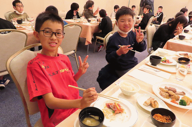 夕食は、テーブルマナーを兼ねての洋食メニューです。外側からフォークやナイフを使うなど、マナーに気を取られじっくり味わうことができなかった子もいたとかいないとか。その後は、お風呂も終えて部屋でぐっすり?眠れたようです。