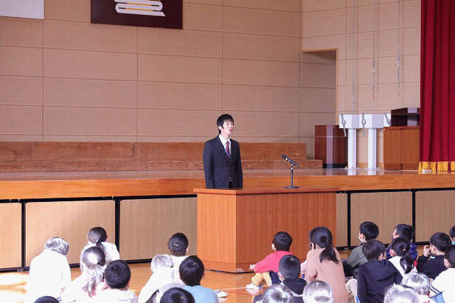 まず、1・3・5年生の代表児童の作文発表です。3名とも2学期に頑張ったことや反省を踏まえて、3学期の目標について発表してくれました。声もしっかり出ていて立派な発表でした。