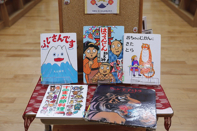 また、本のもりの中の展示も、「ふじさんです」「おはつてんじん」「おちゃのじかんにきたとら」「十二支のお節料理」「ウェン王子とトラ」になっています。