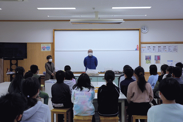 最後に、橋本さんがお話をされました。選別の途中に尋ねられた子供たちからの質問にも答えていただきました。使えない大豆はどうするのかという質問に対し、橋本さんのお宅で牛を飼育されているので、その飼料にされると答えていただきました。さらに、牛が大豆などを食べると排泄します。それを堆肥として食物を作ります。できた作物の一部がまた牛の飼料になります。すなわち循環型農業です。このことも評価され世界農業遺産に認定されたという話もしていただきました。子供たちは、社会科や総合的な学習の時間、家庭科などで学んできており、橋本さんの話を納得して聞いていました。