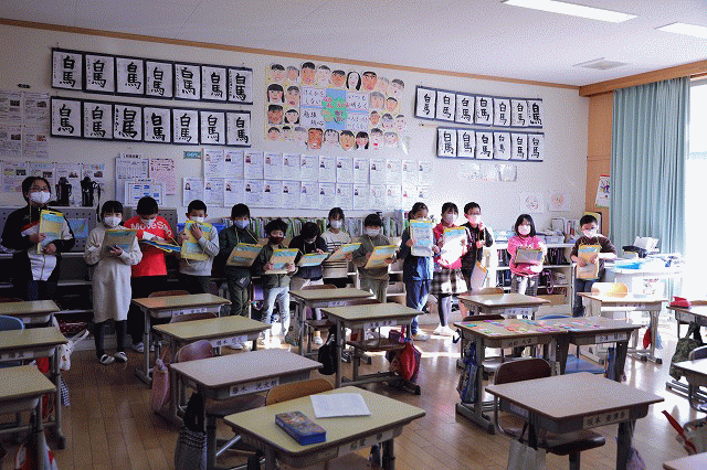 先日、学校へ額装した賞状が届いたので、昼休みに校長先生から賞状を渡していただきました。4名の子供たちおめでとうございます。残念ながら選ばれなかった人たちも、とてもよく頑張りました。素晴らしい作品でしたよ。